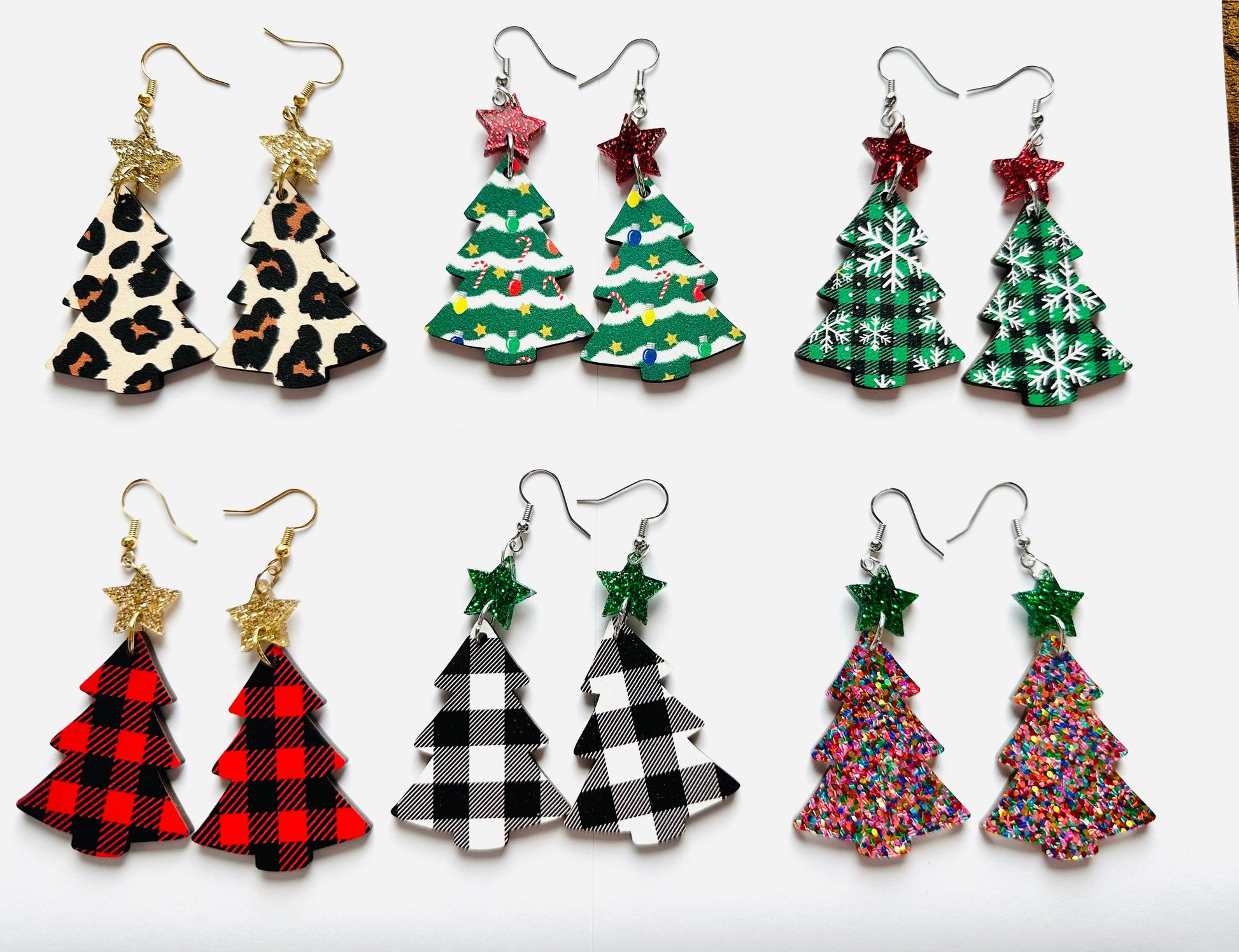 The cutest Christmas tree earrings that you ever did see! The pattern on the earrings is on the front and the back. These earrings are made out of wood and acrylic & hang 2.25 inches.