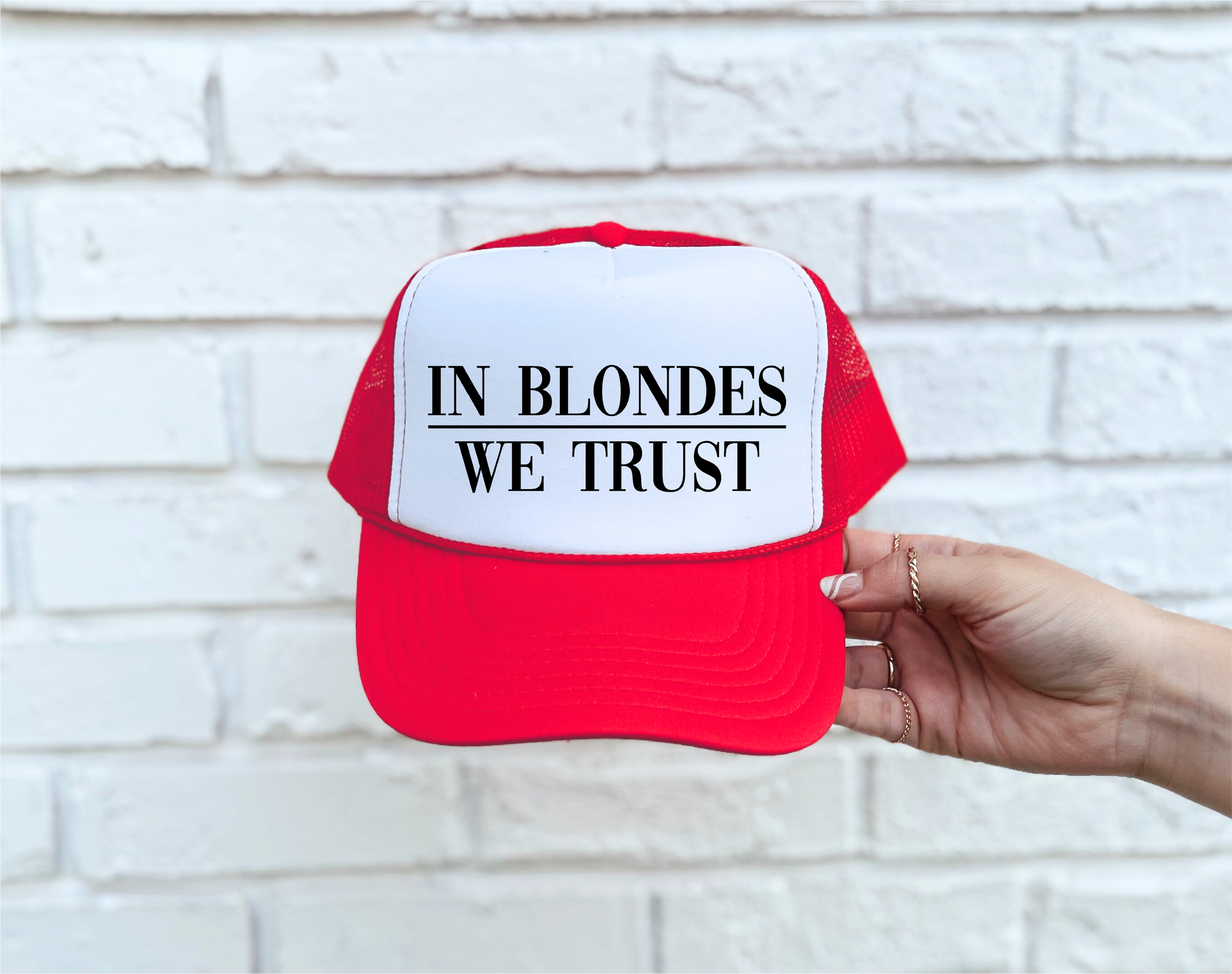 "In Blondes We Trust" design direct-to-film printed on a Red & White foam trucker hat. The perfect accessory to make a bold statement!