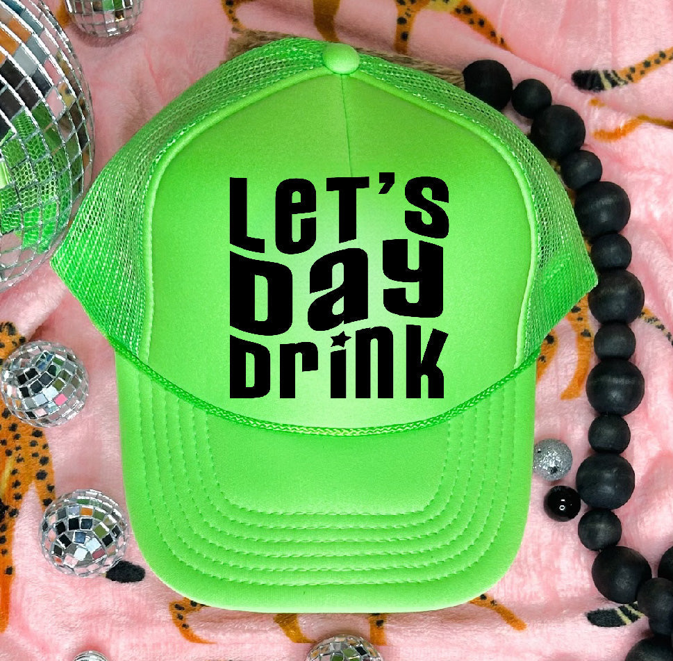 "Let's Day Drink" design direct-to-film printed on a Neon Green foam trucker hat. The perfect accessory to make a bold statement!